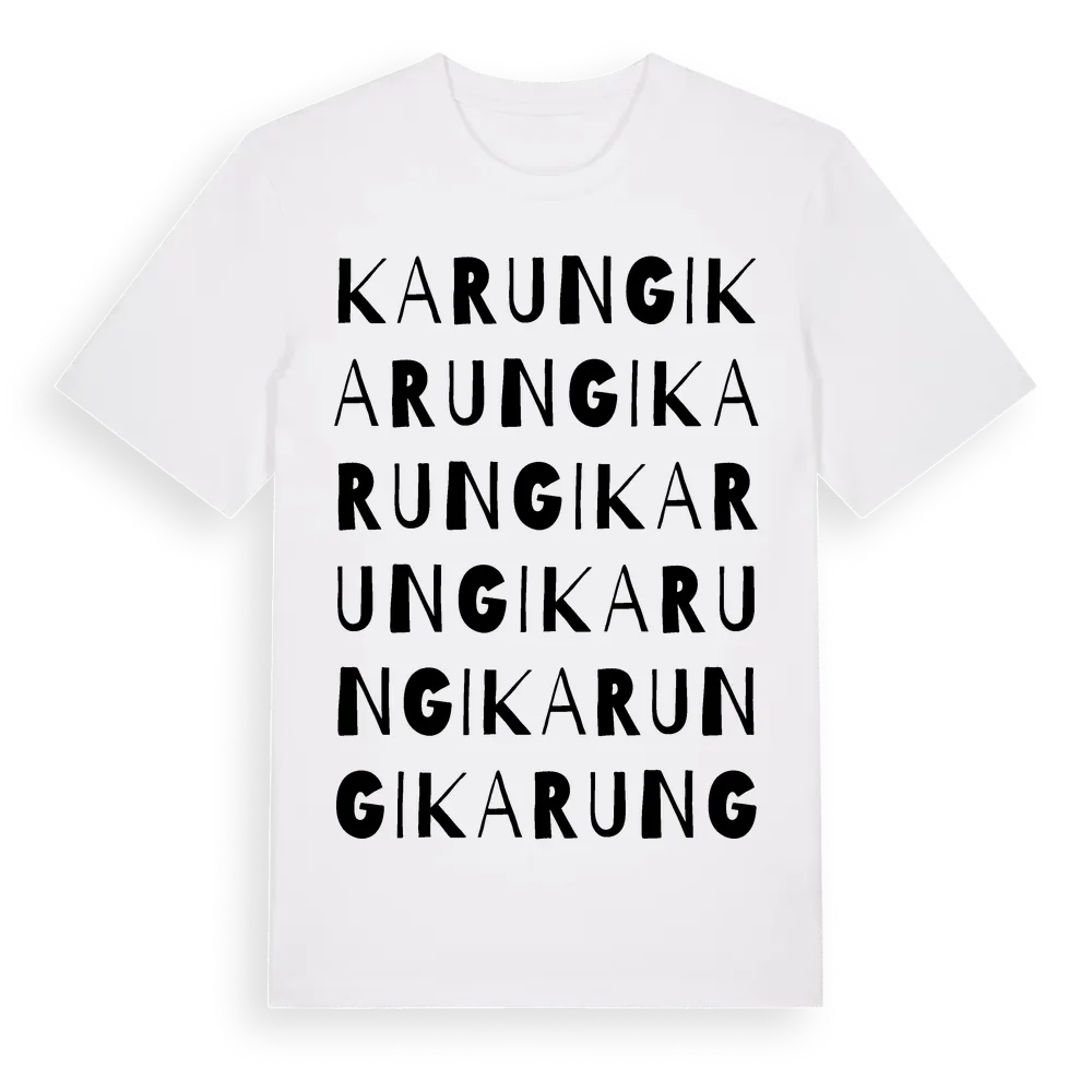 Karungi ordlek t-shirt är inspirerad av byn Karungi i Norrbottens län, Sverige. Tröjan är designad för dig som har en speciell koppling till platsen – oavsett om du bor här, har rötterna här eller bara älskar Karungi.