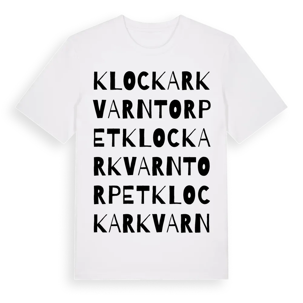 Klockarkvarntorpet ordlek t-shirt är inspirerad av Klockarkvarntorpet i Norrbottens län, Sverige. Tröjan är designad för dig som har en speciell koppling till platsen – oavsett om du bor här, har rötterna här eller bara älskar Klockarkvarntorpet.