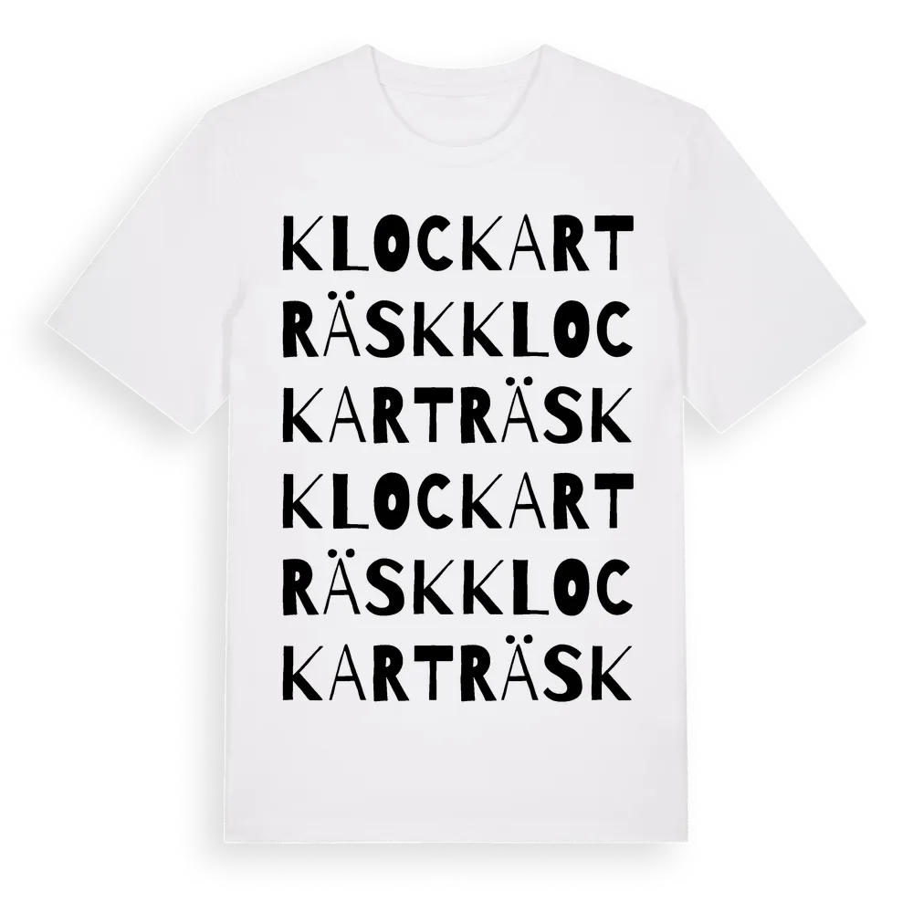 Klockarträsk ordlek t-shirt är inspirerad av byn Klockarträsk i Norrbottens län, Sverige. Tröjan är designad för dig som har en speciell koppling till platsen – oavsett om du bor här, har rötterna här eller bara älskar Klockarträsk.