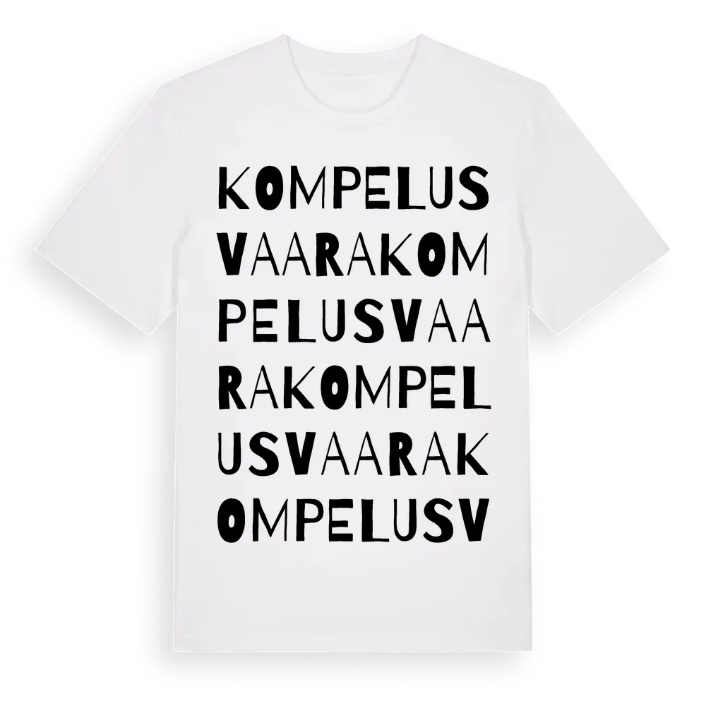 En ordlek byggd på Kompelusvaaras namn. Subtilt och klurig – ett motiv som bara de som verkligen känner platsen fullt ut förstår. Premium bomull, unisex – från byn Kompelusvaara i Norrbottens län.