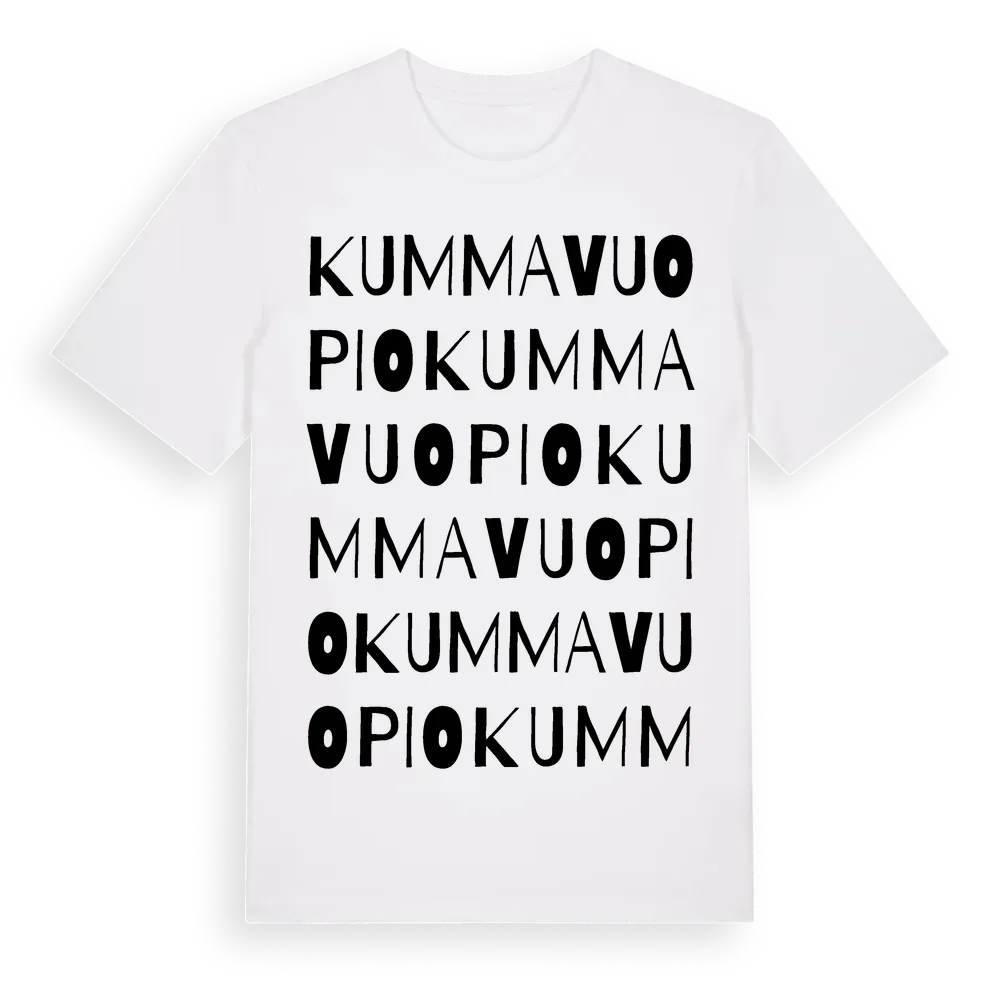 Kummavuopio ordlek t-shirt är inspirerad av Kummavuopio i Norrbottens län, Sverige. Tröjan är designad för dig som har en speciell koppling till platsen – oavsett om du bor här, har rötterna här eller bara älskar Kummavuopio.