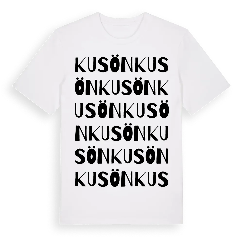 Kusön ordlek t-shirt är inspirerad av ön Kusön i Norrbottens län, Sverige. Tröjan är designad för dig som har en speciell koppling till platsen – oavsett om du bor här, har rötterna här eller bara älskar Kusön.