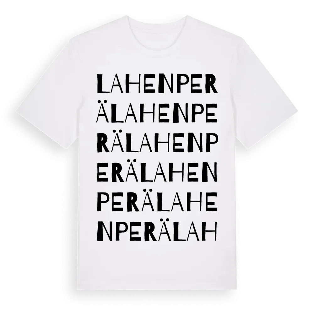 Lahenperä ordlek t-shirt är inspirerad av Lahenperä i Norrbottens län, Sverige. Tröjan är designad för dig som har en speciell koppling till platsen – oavsett om du bor här, har rötterna här eller bara älskar Lahenperä.