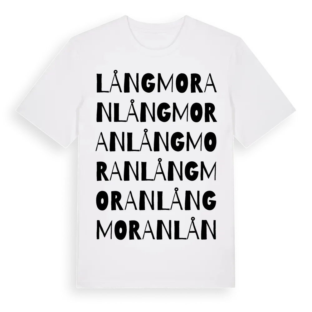 Långmoran ordlek t-shirt är inspirerad av Långmoran i Norrbottens län, Sverige. Tröjan är designad för dig som har en speciell koppling till platsen – oavsett om du bor här, har rötterna här eller bara älskar Långmoran.