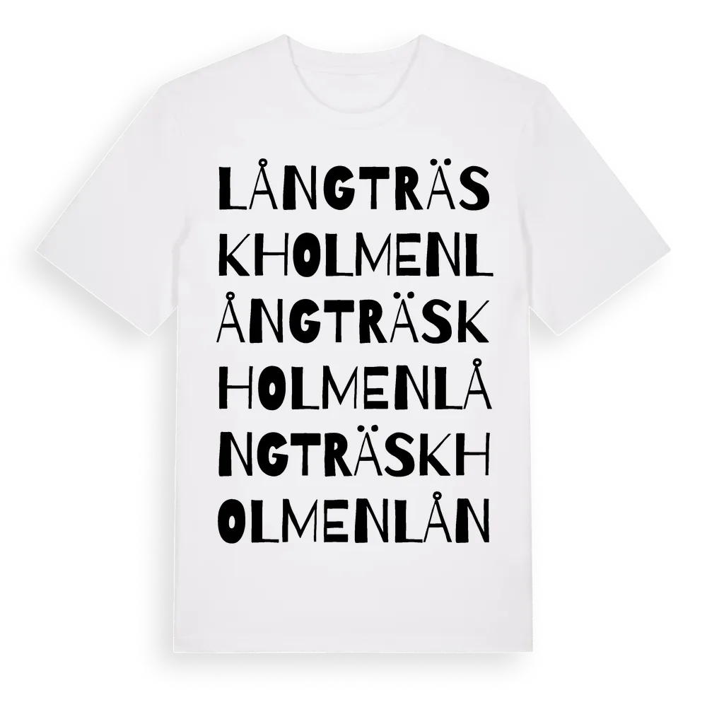 Långträskholmen ordlek t-shirt är inspirerad av Långträskholmen i Norrbottens län, Sverige. Tröjan är designad för dig som har en speciell koppling till platsen – oavsett om du bor här, har rötterna här eller bara älskar Långträskholmen.
