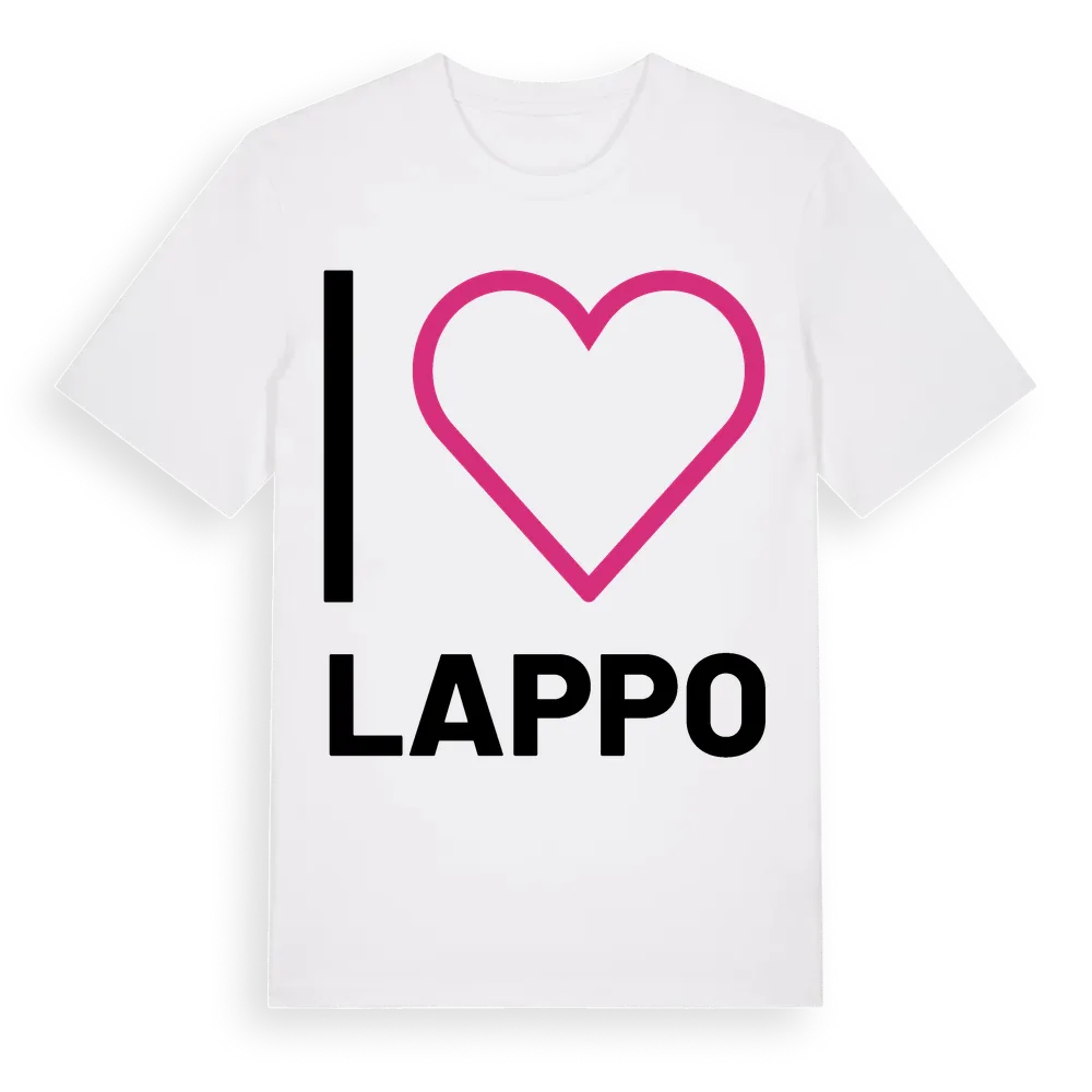 Det klassiska "I ❤ Lappo"-motivet i stort format som täcker hela bröstet. För dig som vill visa kärleken till Lappo på riktigt. Premium bomull, unisex – från Lappo i Norrbottens län.