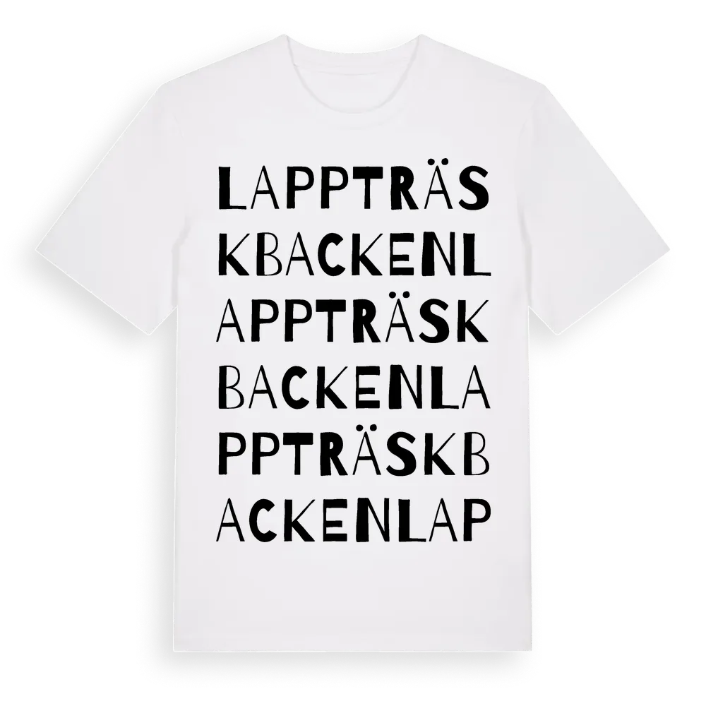 Lappträskbacken ordlek t-shirt är inspirerad av byn Lappträskbacken i Norrbottens län, Sverige. Tröjan är designad för dig som har en speciell koppling till platsen – oavsett om du bor här, har rötterna här eller bara älskar Lappträskbacken.