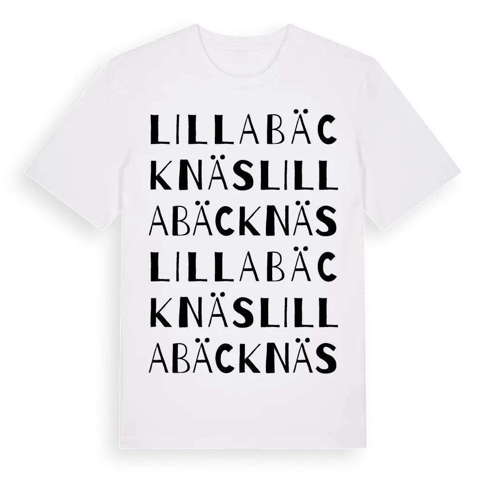 Lilla Bäcknäs ordlek t-shirt är inspirerad av Lilla Bäcknäs i Norrbottens län, Sverige. Tröjan är designad för dig som har en speciell koppling till platsen – oavsett om du bor här, har rötterna här eller bara älskar Lilla Bäcknäs.