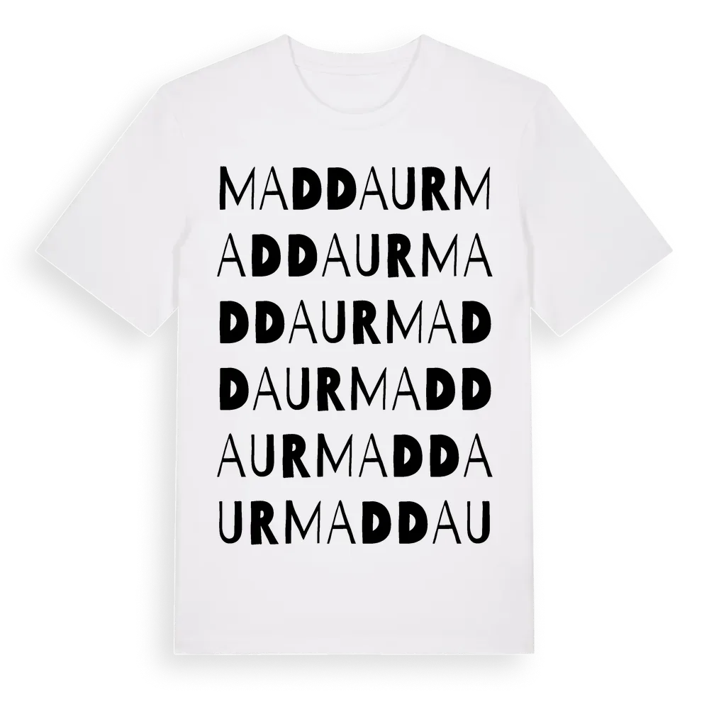 Maddaur ordlek t-shirt är inspirerad av Maddaur i Norrbottens län, Sverige. Tröjan är designad för dig som har en speciell koppling till platsen – oavsett om du bor här, har rötterna här eller bara älskar Maddaur.