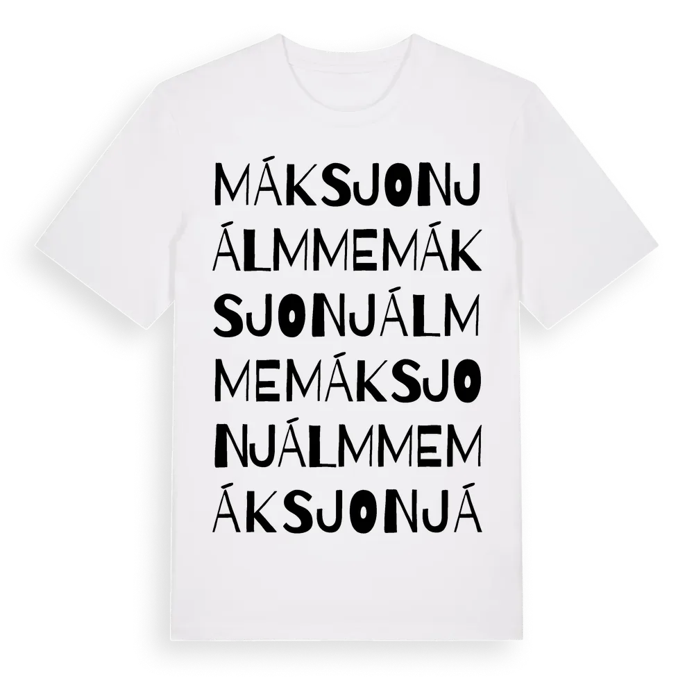 Máksjonjálmme ordlek t-shirt är inspirerad av Máksjonjálmme i Norrbottens län, Sverige. Tröjan är designad för dig som har en speciell koppling till platsen – oavsett om du bor här, har rötterna här eller bara älskar Máksjonjálmme.