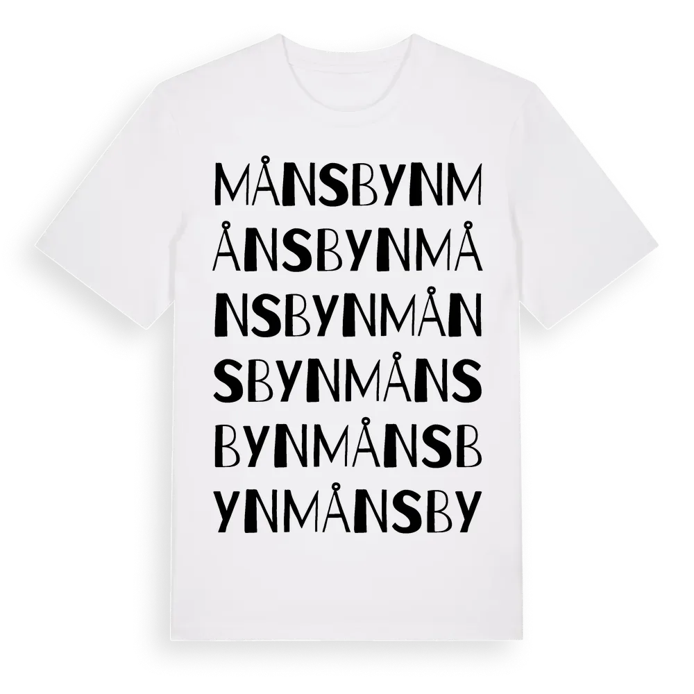 Månsbyn ordlek t-shirt är inspirerad av byn Månsbyn i Norrbottens län, Sverige. Tröjan är designad för dig som har en speciell koppling till platsen – oavsett om du bor här, har rötterna här eller bara älskar Månsbyn.