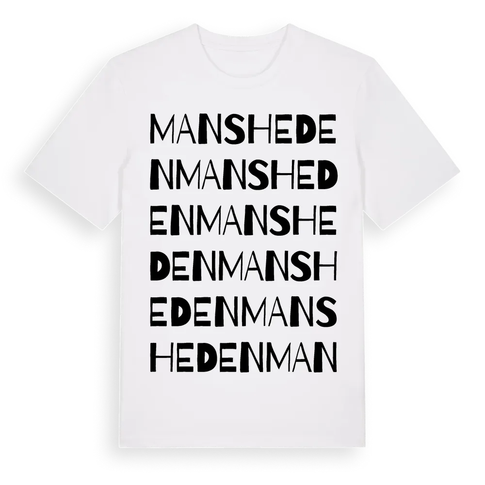 Mansheden ordlek t-shirt är inspirerad av byn Mansheden i Norrbottens län, Sverige. Tröjan är designad för dig som har en speciell koppling till platsen – oavsett om du bor här, har rötterna här eller bara älskar Mansheden.