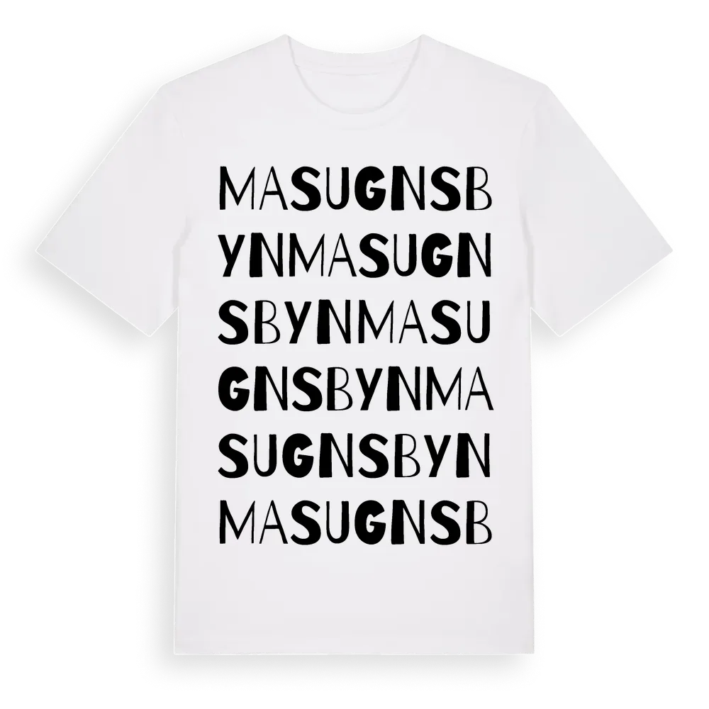 Masugnsbyn ordlek t-shirt är inspirerad av byn Masugnsbyn i Norrbottens län, Sverige. Tröjan är designad för dig som har en speciell koppling till platsen – oavsett om du bor här, har rötterna här eller bara älskar Masugnsbyn.