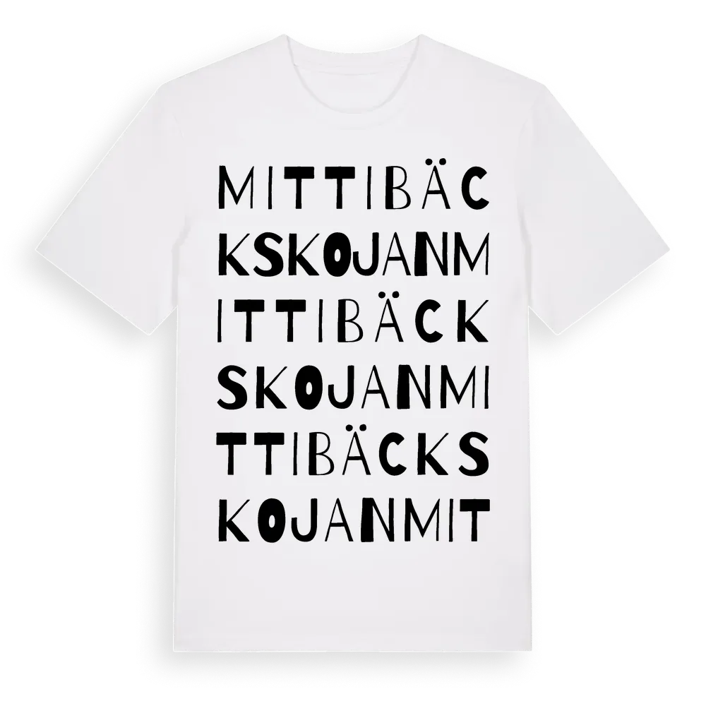 Mittibäckskojan ordlek t-shirt är inspirerad av Mittibäckskojan i Norrbottens län, Sverige. Tröjan är designad för dig som har en speciell koppling till platsen – oavsett om du bor här, har rötterna här eller bara älskar Mittibäckskojan.