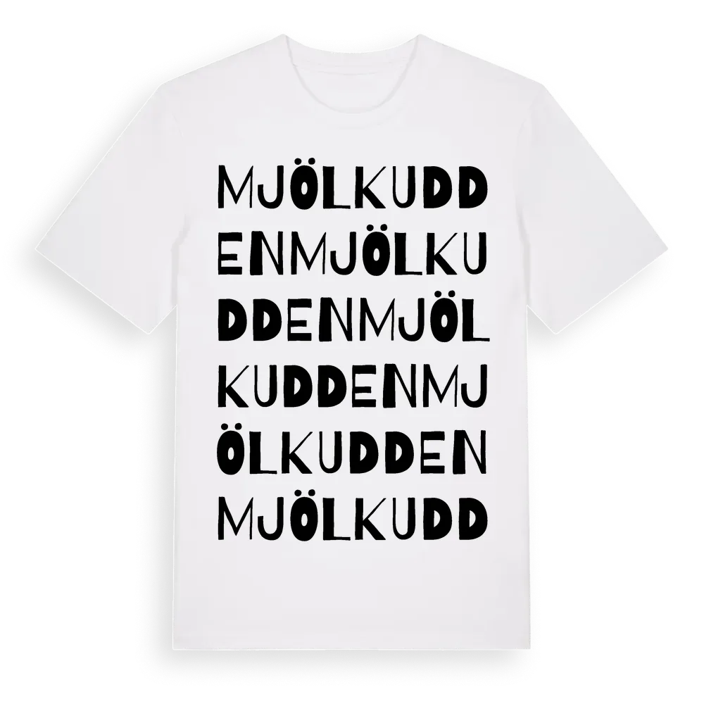 En ordlek byggd på Mjölkuddens namn. Subtilt och klurig – ett motiv som bara de som verkligen känner platsen fullt ut förstår. Premium bomull, unisex – från stadsdelen Mjölkudden i Norrbottens län.