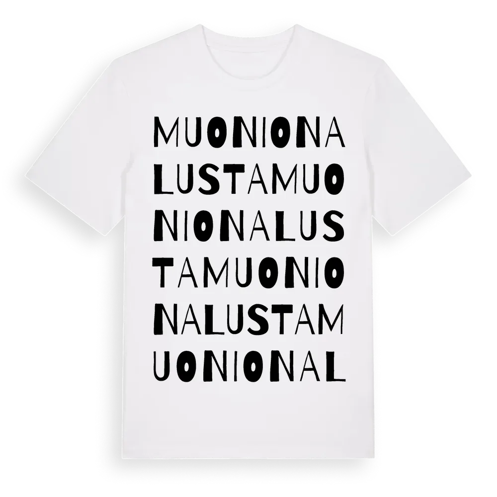 En ordlek byggd på Muonionalustas namn. Subtilt och klurig – ett motiv som bara de som verkligen känner platsen fullt ut förstår. Premium bomull, unisex – från byn Muonionalusta i Norrbottens län.