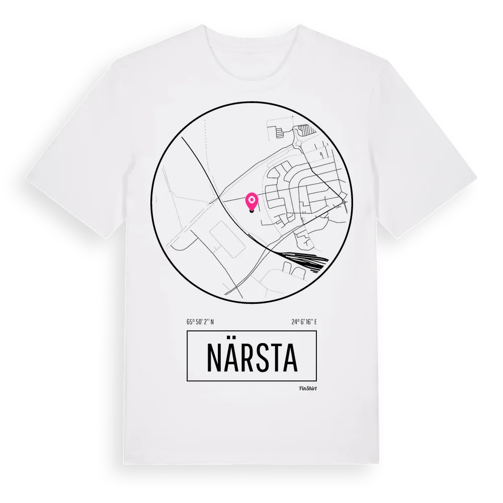 Närsta t-shirt är inspirerad av stadsdelen Närsta i Norrbottens län, Sverige. Tröjan är designad för dig som har en speciell koppling till platsen – oavsett om du bor här, har rötterna här eller bara älskar Närsta.