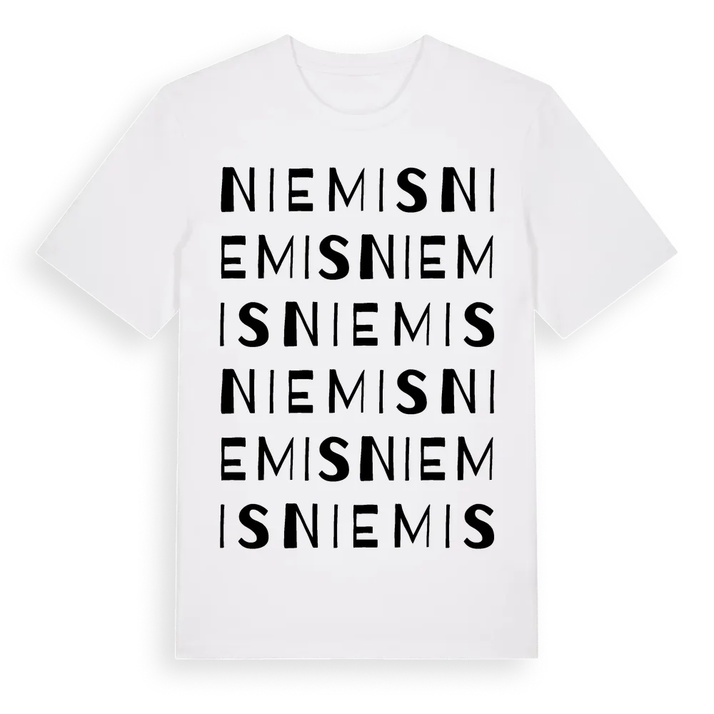 En ordlek byggd på Niemiss namn. Subtilt och klurig – ett motiv som bara de som verkligen känner platsen fullt ut förstår. Premium bomull, unisex – från byn Niemis i Norrbottens län.