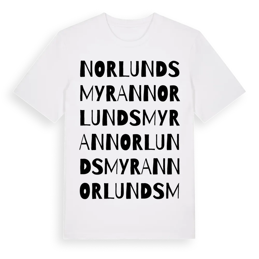 Norlundsmyran ordlek t-shirt är inspirerad av Norlundsmyran i Norrbottens län, Sverige. Tröjan är designad för dig som har en speciell koppling till platsen – oavsett om du bor här, har rötterna här eller bara älskar Norlundsmyran.