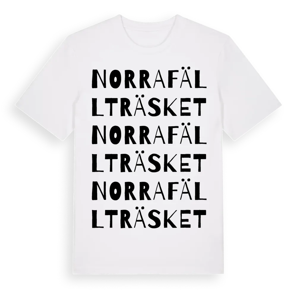 Norra Fällträsket ordlek t-shirt är inspirerad av byn Norra Fällträsket i Norrbottens län, Sverige. Tröjan är designad för dig som har en speciell koppling till platsen – oavsett om du bor här, har rötterna här eller bara älskar Norra Fällträsket.