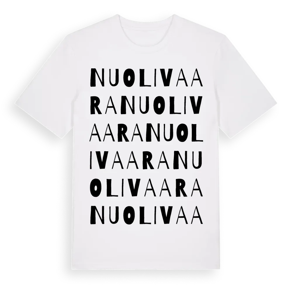 En ordlek byggd på Nuolivaaras namn. Subtilt och klurig – ett motiv som bara de som verkligen känner platsen fullt ut förstår. Premium bomull, unisex – från Nuolivaara i Norrbottens län.