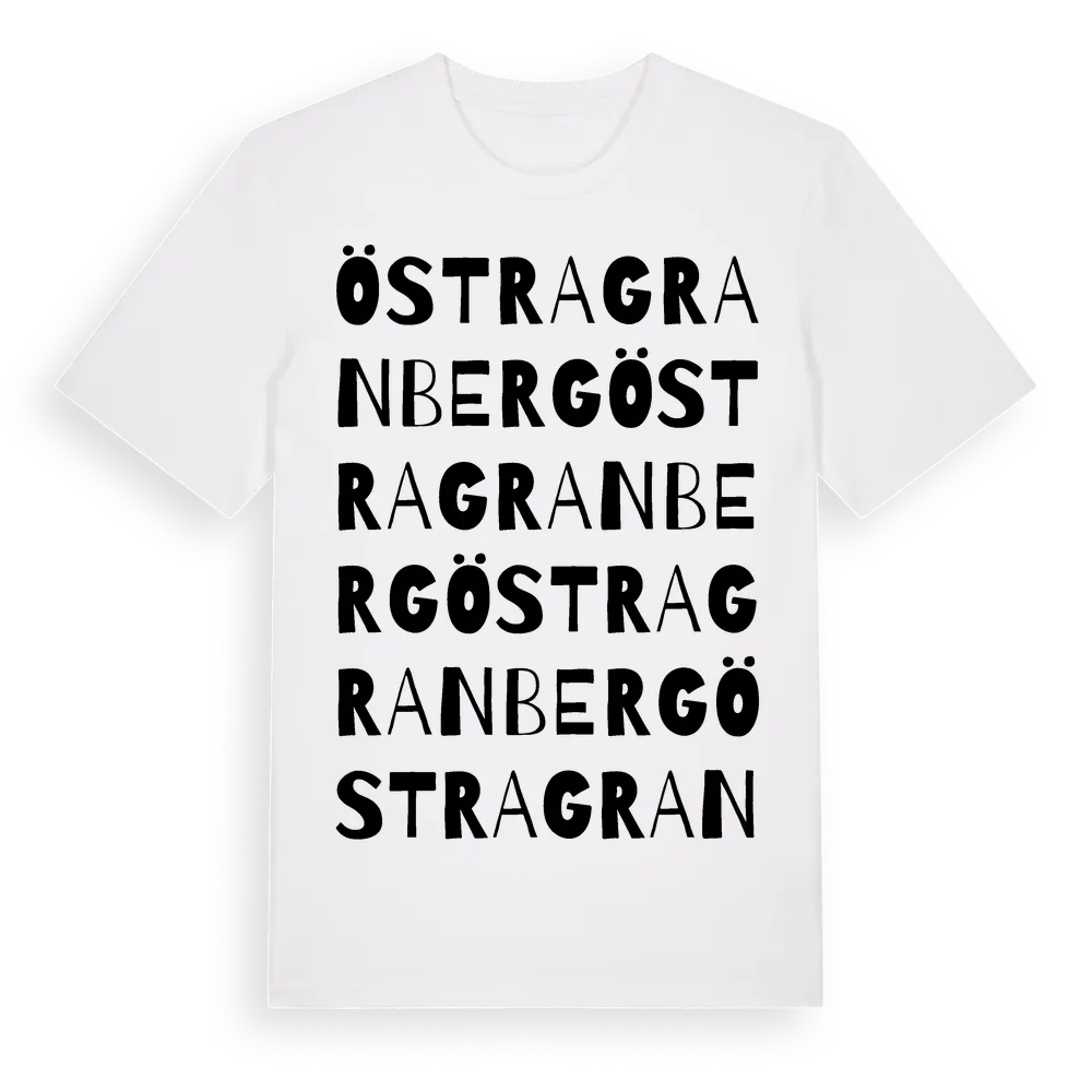 Östra Granberg ordlek t-shirt är inspirerad av Östra Granberg i Norrbottens län, Sverige. Tröjan är designad för dig som har en speciell koppling till platsen – oavsett om du bor här, har rötterna här eller bara älskar Östra Granberg.