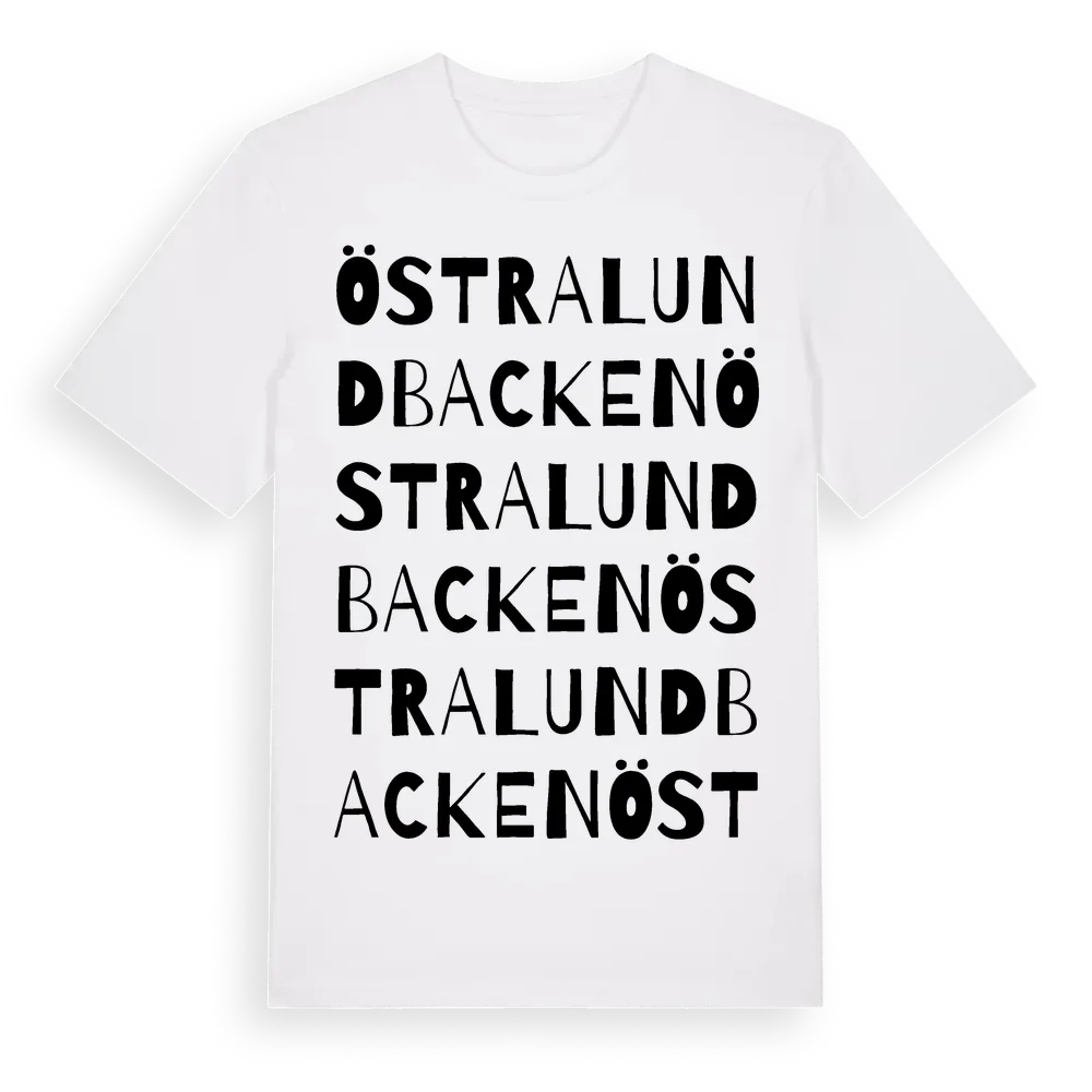 Östra Lundbacken ordlek t-shirt är inspirerad av Östra Lundbacken i Norrbottens län, Sverige. Tröjan är designad för dig som har en speciell koppling till platsen – oavsett om du bor här, har rötterna här eller bara älskar Östra Lundbacken.