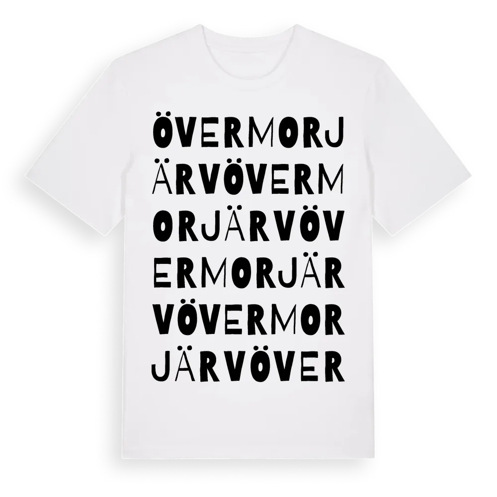 Övermorjärv ordlek t-shirt är inspirerad av byn Övermorjärv i Norrbottens län, Sverige. Tröjan är designad för dig som har en speciell koppling till platsen – oavsett om du bor här, har rötterna här eller bara älskar Övermorjärv.