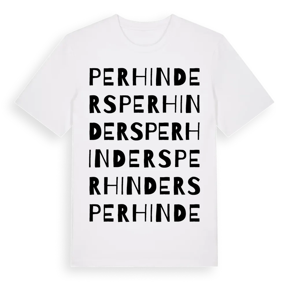 Per Hinders ordlek t-shirt är inspirerad av Per Hinders i Norrbottens län, Sverige. Tröjan är designad för dig som har en speciell koppling till platsen – oavsett om du bor här, har rötterna här eller bara älskar Per Hinders.
