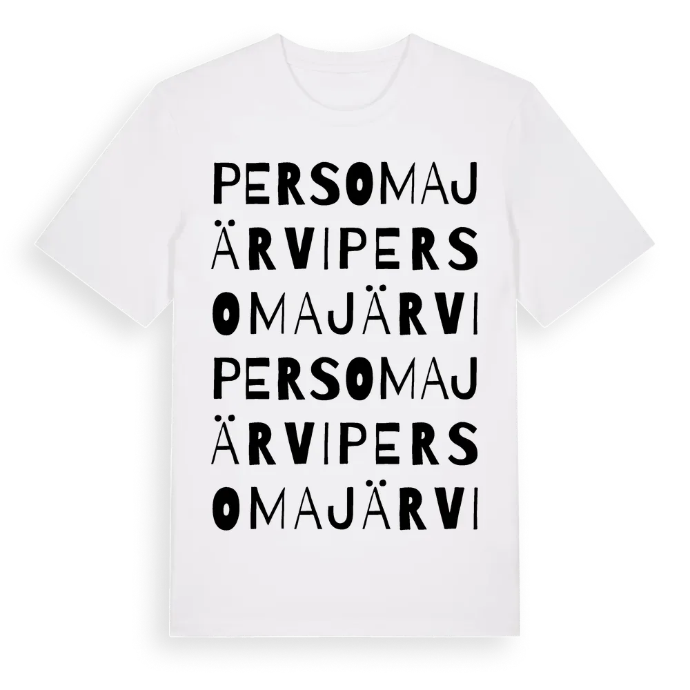 Persomajärvi ordlek t-shirt är inspirerad av byn Persomajärvi i Norrbottens län, Sverige. Tröjan är designad för dig som har en speciell koppling till platsen – oavsett om du bor här, har rötterna här eller bara älskar Persomajärvi.