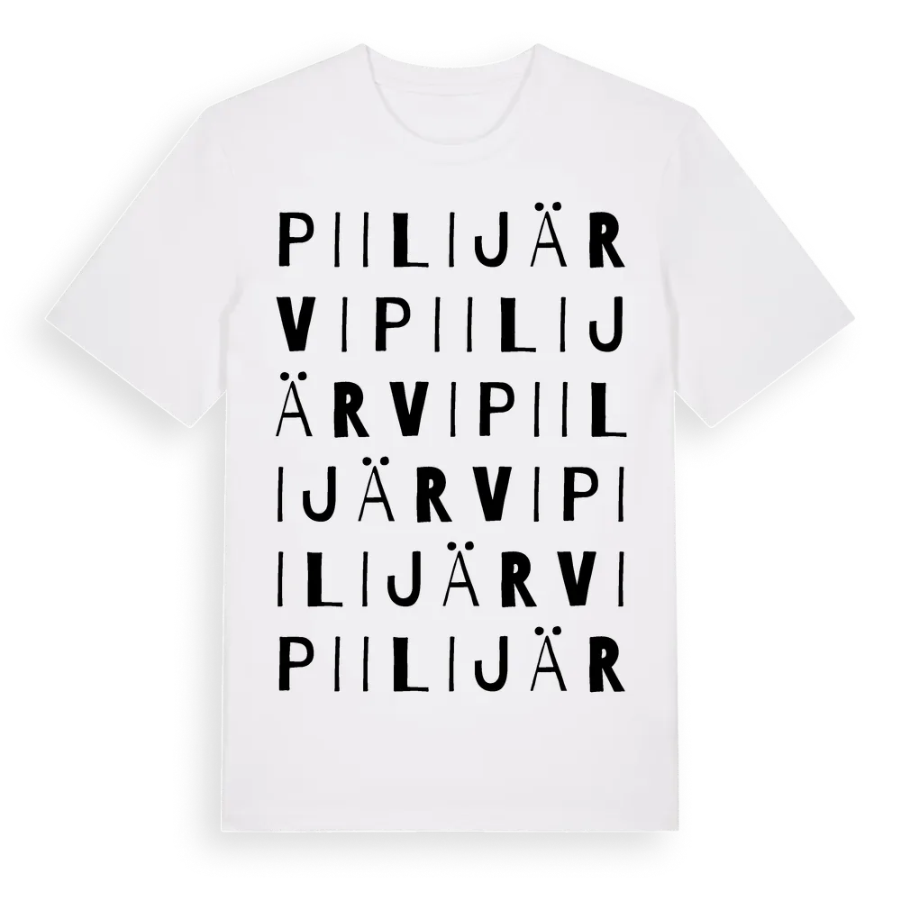 Piilijärvi ordlek t-shirt är inspirerad av byn Piilijärvi i Norrbottens län, Sverige. Tröjan är designad för dig som har en speciell koppling till platsen – oavsett om du bor här, har rötterna här eller bara älskar Piilijärvi.