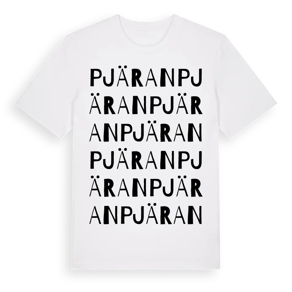 Pjäran ordlek t-shirt är inspirerad av byn Pjäran i Norrbottens län, Sverige. Tröjan är designad för dig som har en speciell koppling till platsen – oavsett om du bor här, har rötterna här eller bara älskar Pjäran.