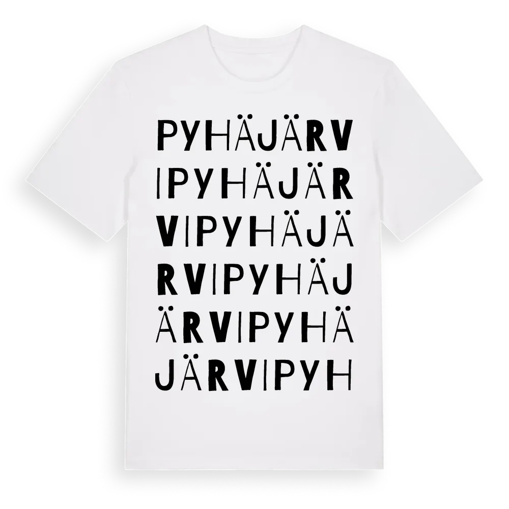 Pyhäjärvi ordlek t-shirt är inspirerad av byn Pyhäjärvi i Norrbottens län, Sverige. Tröjan är designad för dig som har en speciell koppling till platsen – oavsett om du bor här, har rötterna här eller bara älskar Pyhäjärvi.