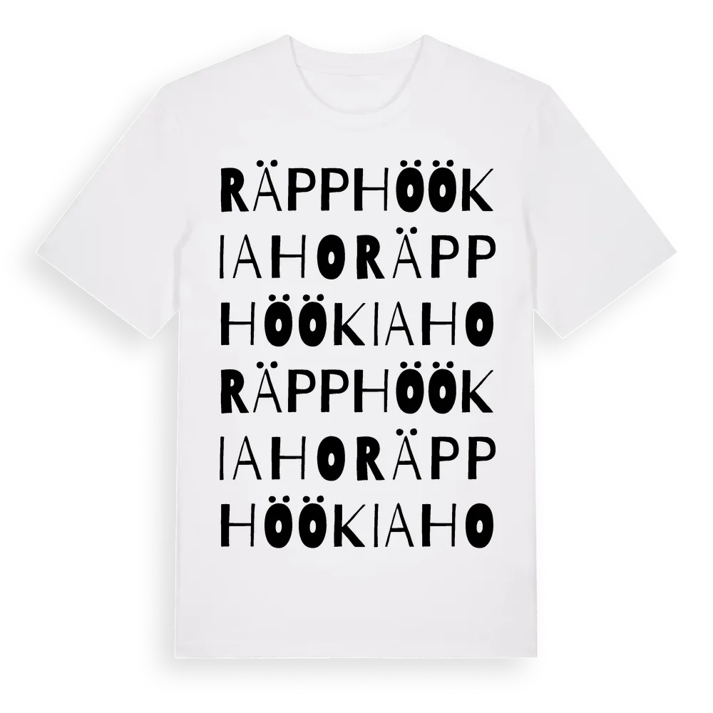 En ordlek byggd på Räpphöökiahos namn. Subtilt och klurig – ett motiv som bara de som verkligen känner platsen fullt ut förstår. Premium bomull, unisex – från Räpphöökiaho i Norrbottens län.