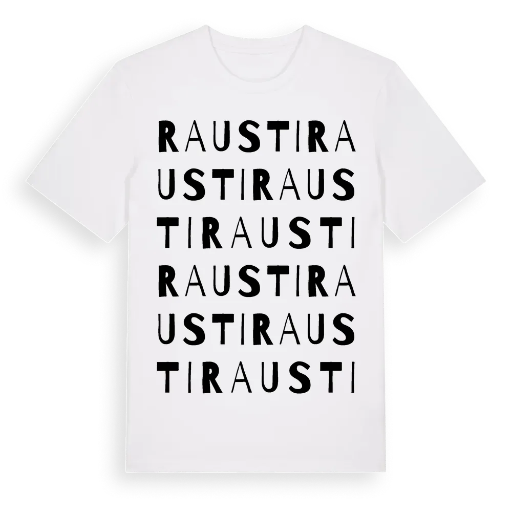 En ordlek byggd på Raustis namn. Subtilt och klurig – ett motiv som bara de som verkligen känner platsen fullt ut förstår. Premium bomull, unisex – från byn Rausti i Norrbottens län.