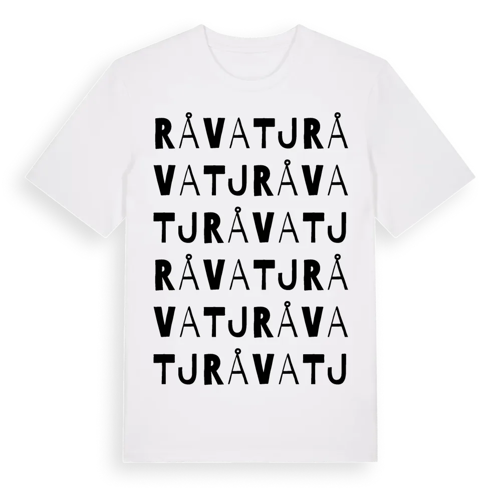 Råvatj ordlek t-shirt är inspirerad av Råvatj i Norrbottens län, Sverige. Tröjan är designad för dig som har en speciell koppling till platsen – oavsett om du bor här, har rötterna här eller bara älskar Råvatj.