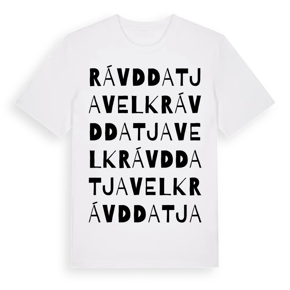 Rávddatjavelk ordlek t-shirt är inspirerad av Rávddatjavelk i Norrbottens län, Sverige. Tröjan är designad för dig som har en speciell koppling till platsen – oavsett om du bor här, har rötterna här eller bara älskar Rávddatjavelk.