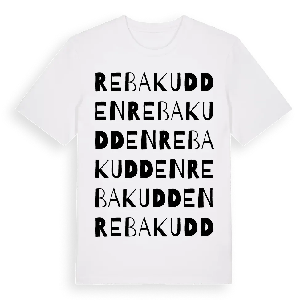 Rebakudden ordlek t-shirt är inspirerad av byn Rebakudden i Norrbottens län, Sverige. Tröjan är designad för dig som har en speciell koppling till platsen – oavsett om du bor här, har rötterna här eller bara älskar Rebakudden.