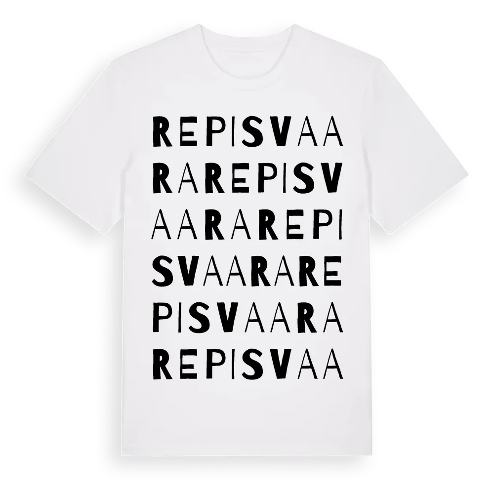 En ordlek byggd på Repisvaaras namn. Subtilt och klurig – ett motiv som bara de som verkligen känner platsen fullt ut förstår. Premium bomull, unisex – från stadsdelen Repisvaara i Norrbottens län.