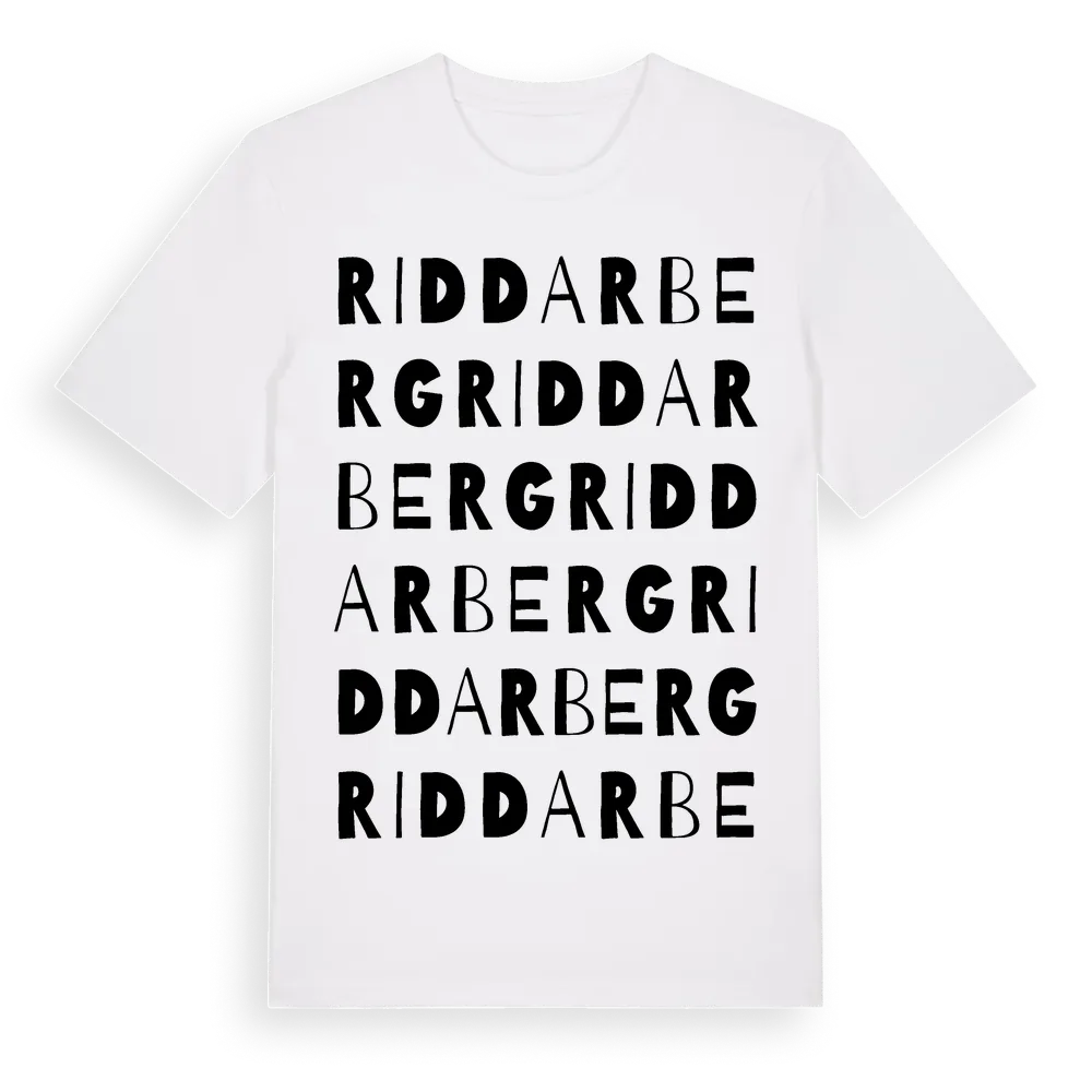Riddarberg ordlek t-shirt är inspirerad av byn Riddarberg i Norrbottens län, Sverige. Tröjan är designad för dig som har en speciell koppling till platsen – oavsett om du bor här, har rötterna här eller bara älskar Riddarberg.