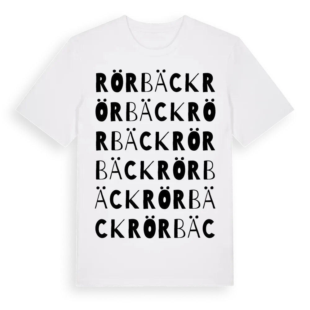 Rörbäck ordlek t-shirt är inspirerad av byn Rörbäck i Norrbottens län, Sverige. Tröjan är designad för dig som har en speciell koppling till platsen – oavsett om du bor här, har rötterna här eller bara älskar Rörbäck.