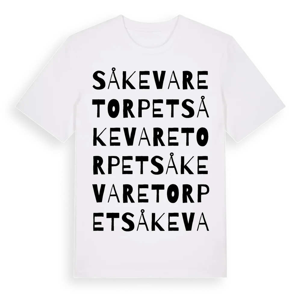 Såkevaretorpet ordlek t-shirt är inspirerad av Såkevaretorpet i Norrbottens län, Sverige. Tröjan är designad för dig som har en speciell koppling till platsen – oavsett om du bor här, har rötterna här eller bara älskar Såkevaretorpet.