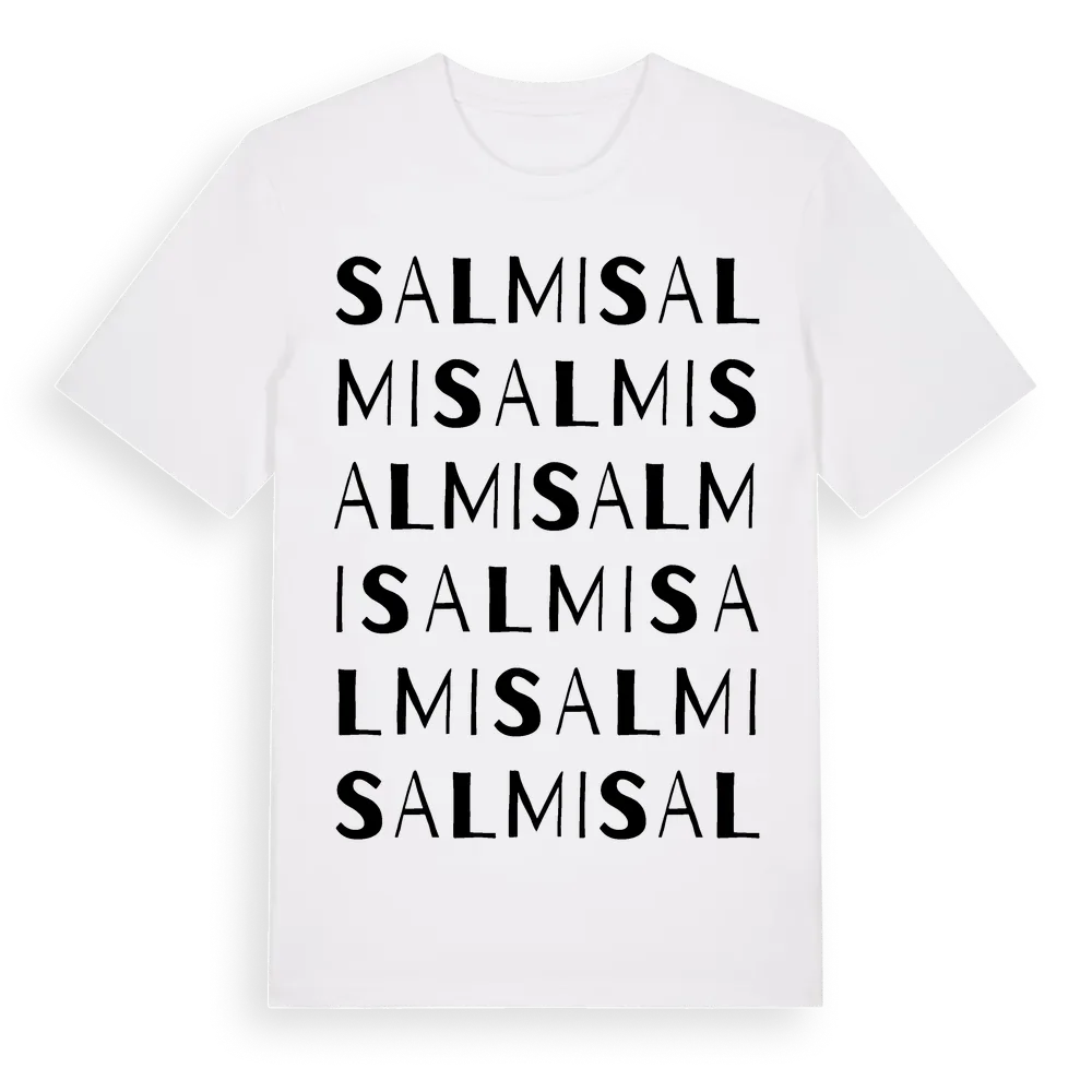 En ordlek byggd på Salmis namn. Subtilt och klurig – ett motiv som bara de som verkligen känner platsen fullt ut förstår. Premium bomull, unisex – från Salmi i Norrbottens län.