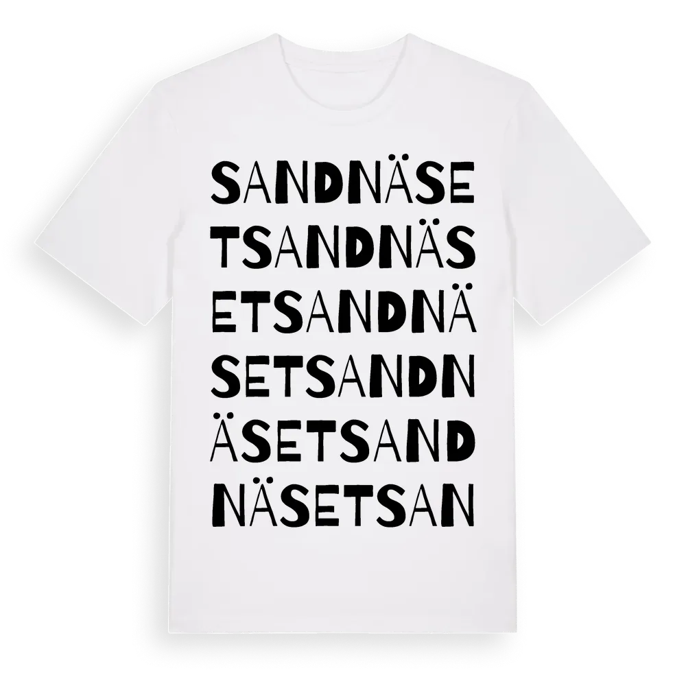 Sandnäset ordlek t-shirt är inspirerad av Sandnäset i Norrbottens län, Sverige. Tröjan är designad för dig som har en speciell koppling till platsen – oavsett om du bor här, har rötterna här eller bara älskar Sandnäset.