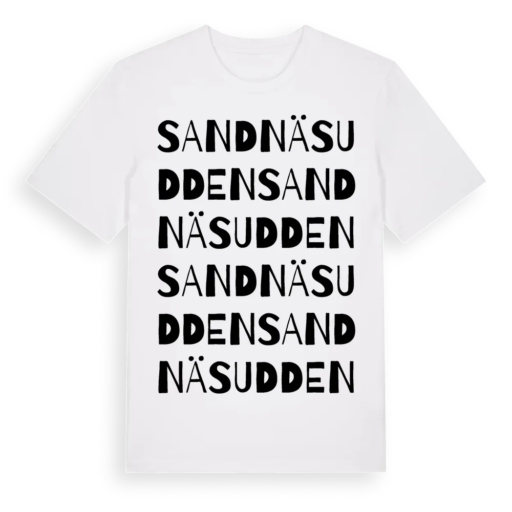 Sandnäsudden ordlek t-shirt är inspirerad av byn Sandnäsudden i Norrbottens län, Sverige. Tröjan är designad för dig som har en speciell koppling till platsen – oavsett om du bor här, har rötterna här eller bara älskar Sandnäsudden.