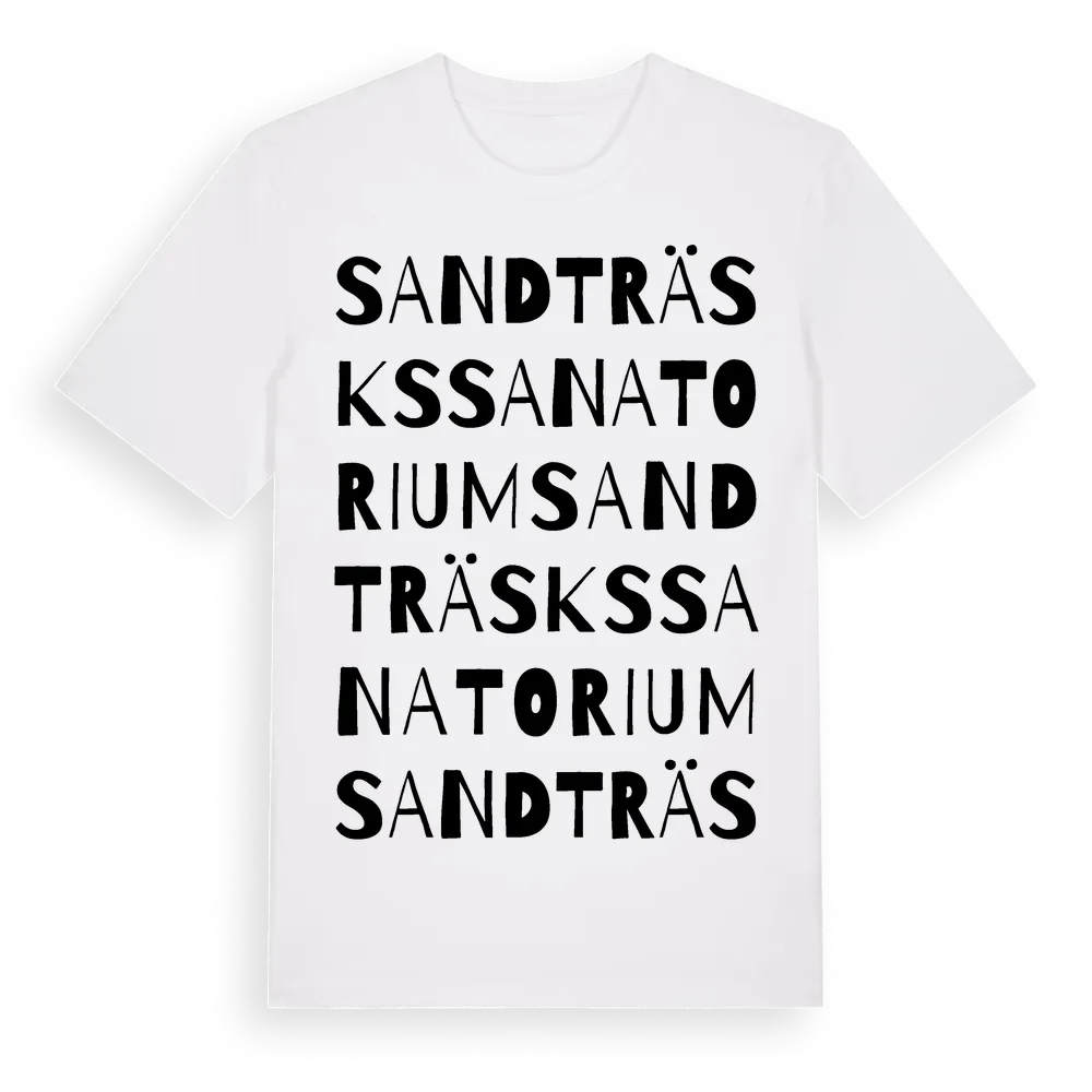 Sandträsks Sanatorium ordlek t-shirt är inspirerad av Sandträsks Sanatorium i Norrbottens län, Sverige. Tröjan är designad för dig som har en speciell koppling till platsen – oavsett om du bor här, har rötterna här eller bara älskar Sandträsks Sanatorium.