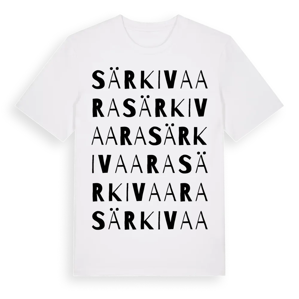 En ordlek byggd på Särkivaaras namn. Subtilt och klurig – ett motiv som bara de som verkligen känner platsen fullt ut förstår. Premium bomull, unisex – från byn Särkivaara i Norrbottens län.
