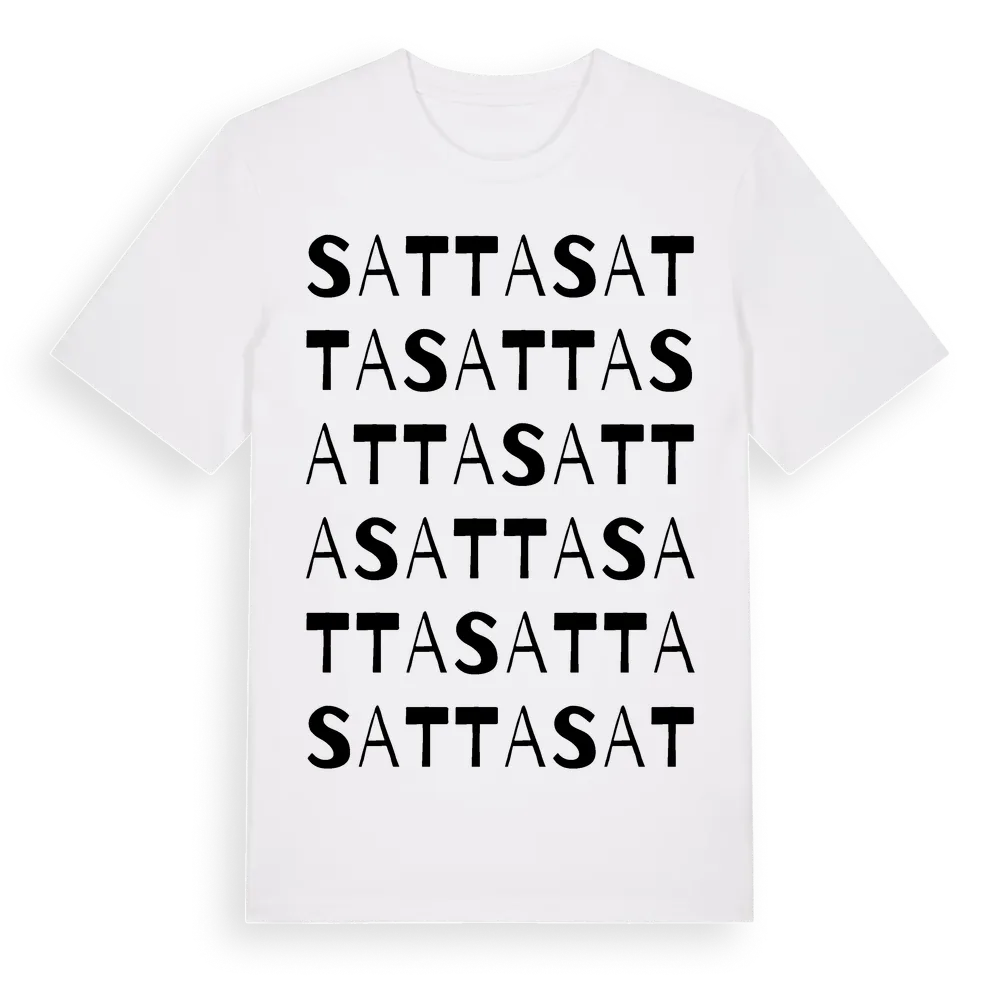 Satta ordlek t-shirt är inspirerad av byn Satta i Norrbottens län, Sverige. Tröjan är designad för dig som har en speciell koppling till platsen – oavsett om du bor här, har rötterna här eller bara älskar Satta.