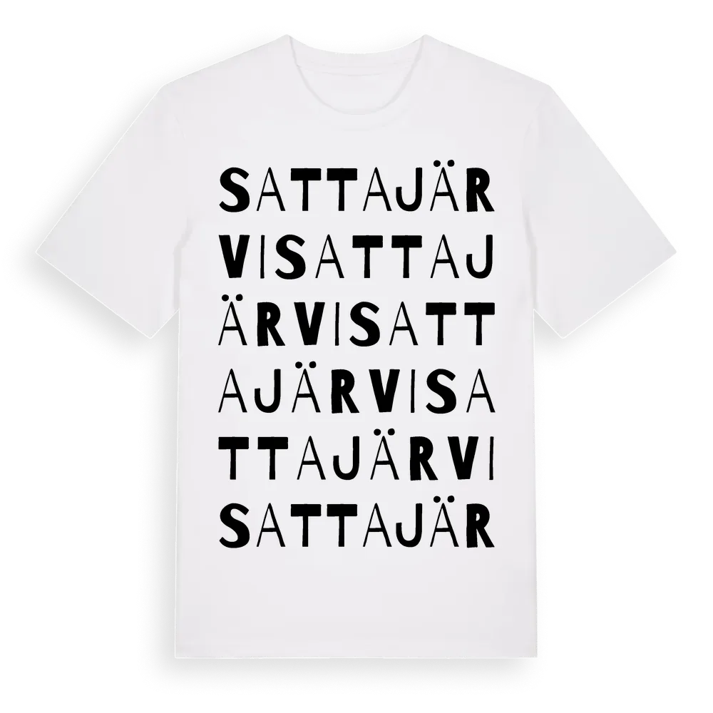 En ordlek byggd på Sattajärvis namn. Subtilt och klurig – ett motiv som bara de som verkligen känner platsen fullt ut förstår. Premium bomull, unisex – från byn Sattajärvi i Norrbottens län.