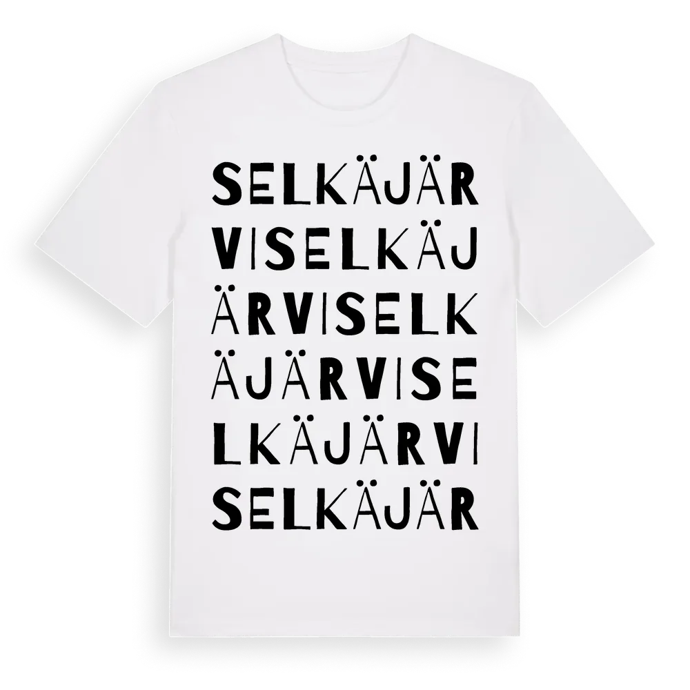 Selkäjärvi ordlek t-shirt är inspirerad av byn Selkäjärvi i Norrbottens län, Sverige. Tröjan är designad för dig som har en speciell koppling till platsen – oavsett om du bor här, har rötterna här eller bara älskar Selkäjärvi.